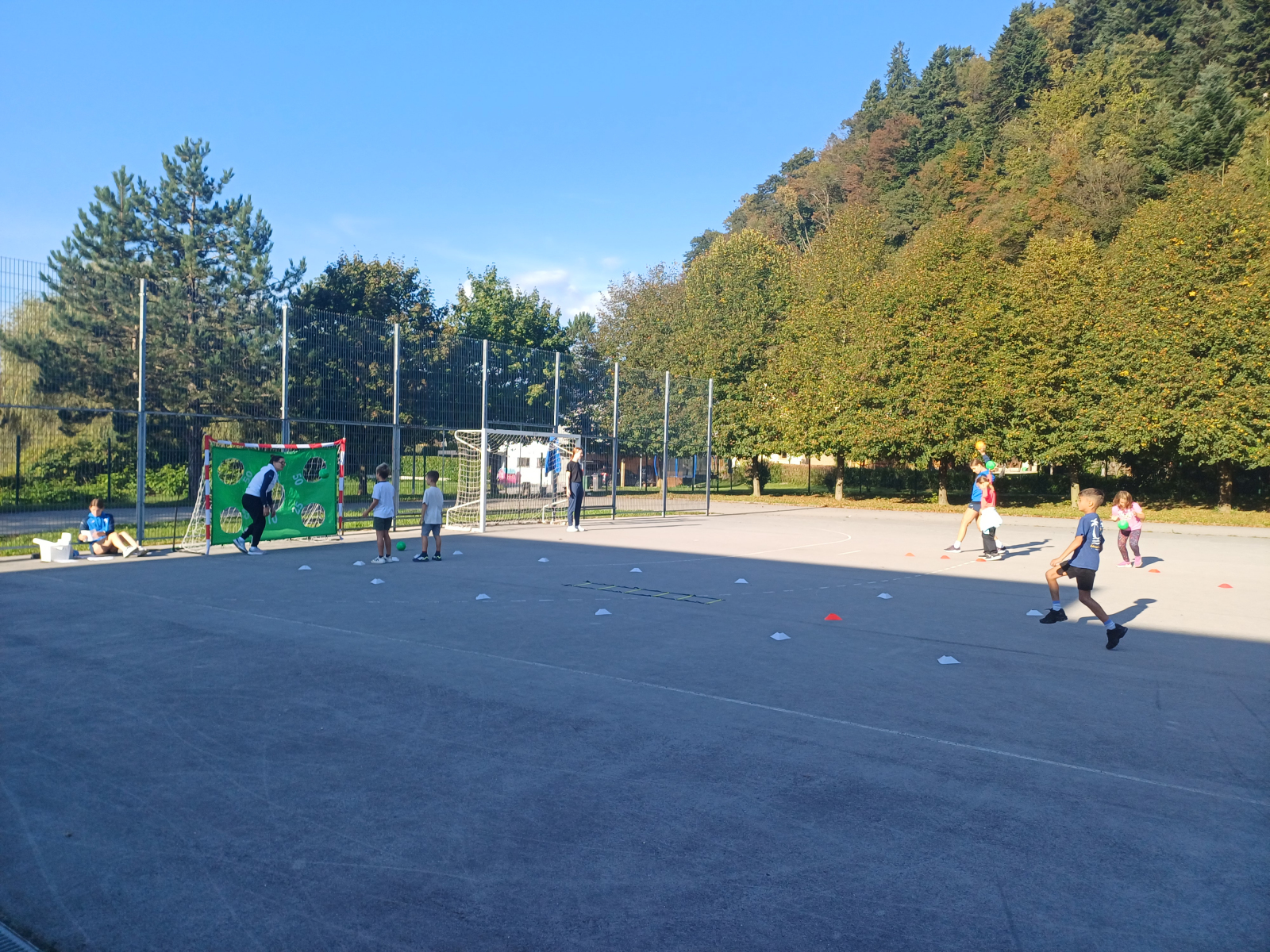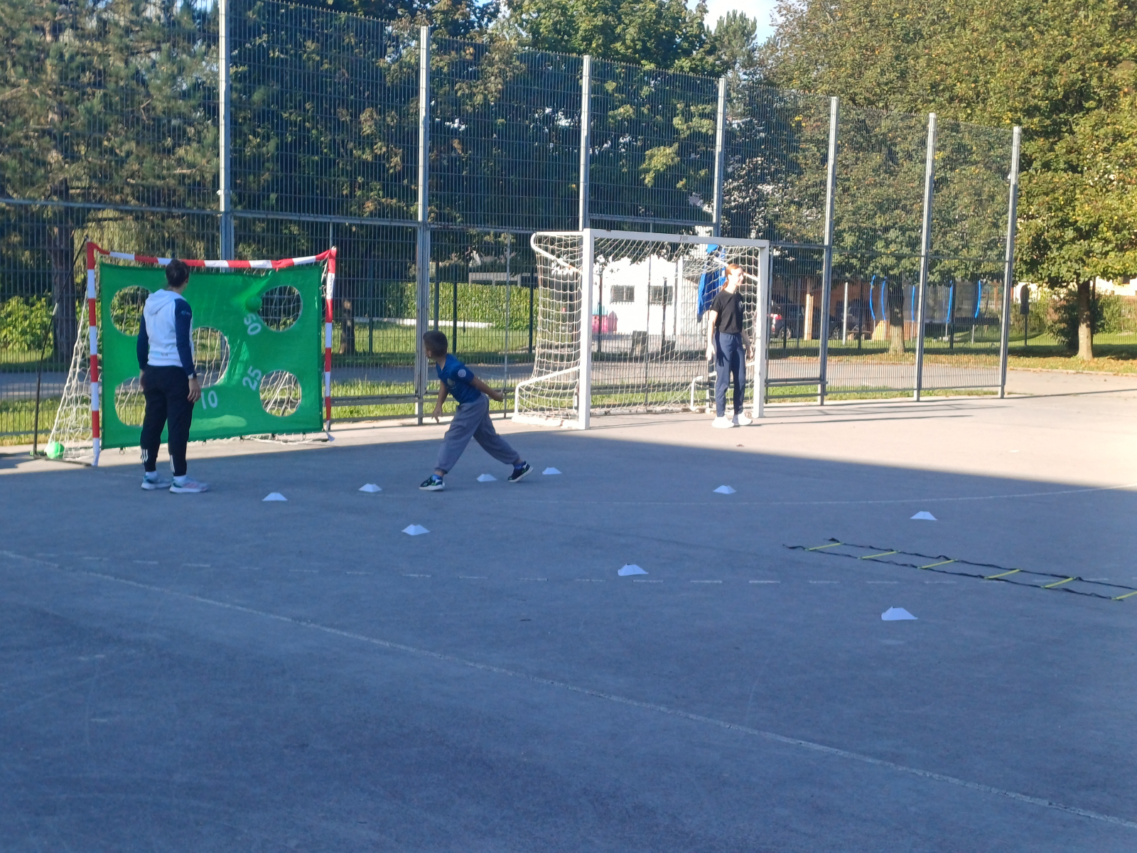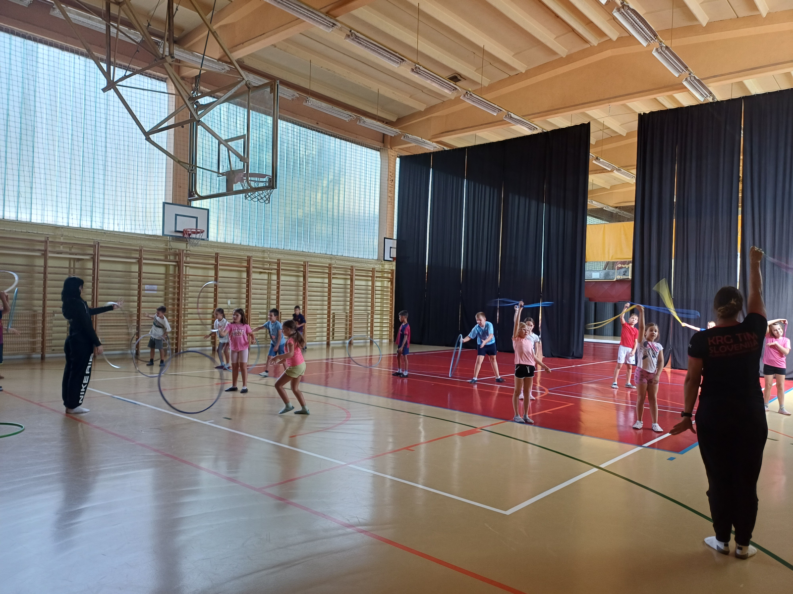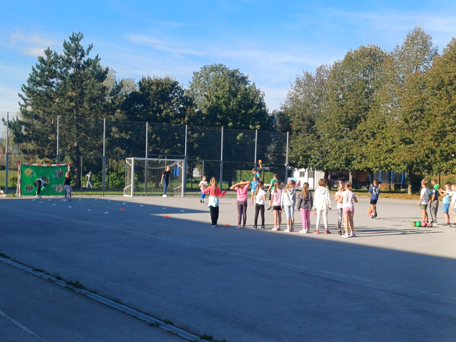 Istočasno so imeli učenci od 1. do 3. razreda športni dan, na katerem so se predstavili zunanji izvajalci športnih dejavnosti. Na igrišču so se učenci spoznali z rokometom. V mali telovadnici so nam Zoja Kogovšek, Helena Vidić in David Malavašič predstavili kate, ki so se jih naučili pri karateju. V veliki telovadnici je Mitja Petkovšek navdušil učence nad gimnastiko. Na koncu so učenci še zaplesali s plesno navijaško skupino Žabice.