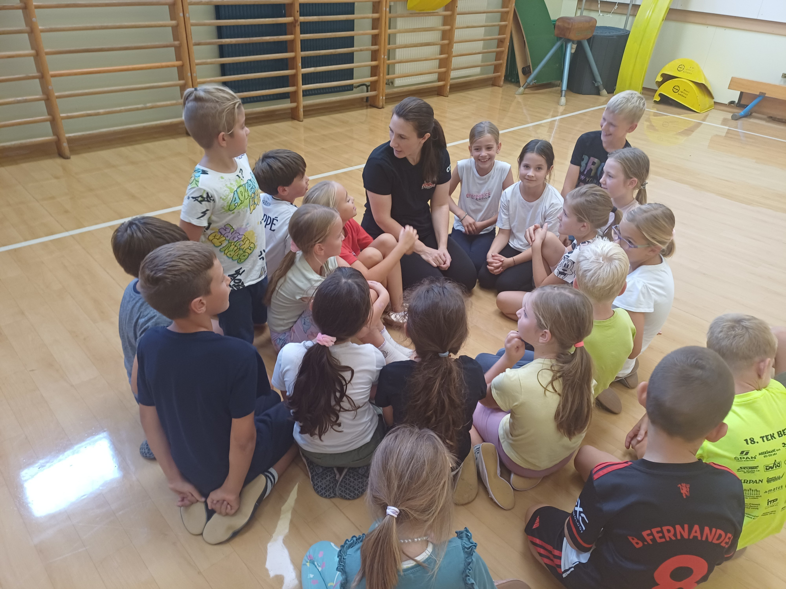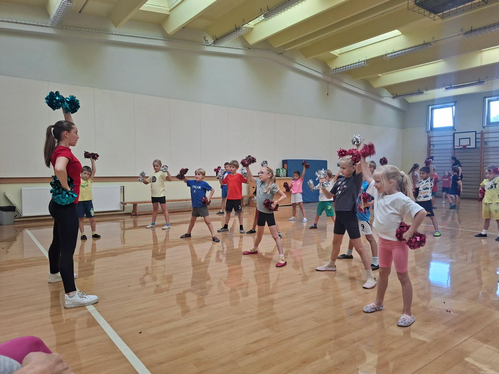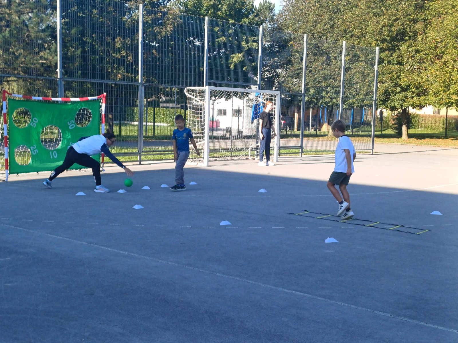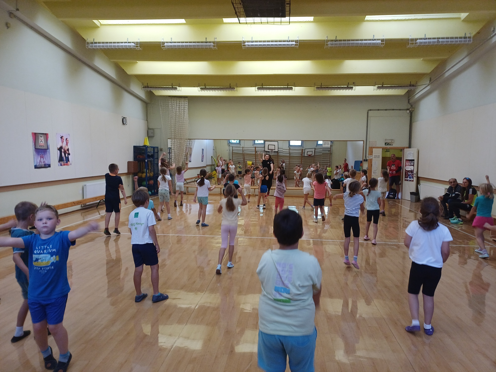 Istočasno so imeli učenci od 1. do 3. razreda športni dan, na katerem so se predstavili zunanji izvajalci športnih dejavnosti. Na igrišču so se učenci spoznali z rokometom. V mali telovadnici so nam Zoja Kogovšek, Helena Vidić in David Malavašič predstavili kate, ki so se jih naučili pri karateju. V veliki telovadnici je Mitja Petkovšek navdušil učence nad gimnastiko. Na koncu so učenci še zaplesali s plesno navijaško skupino Žabice.